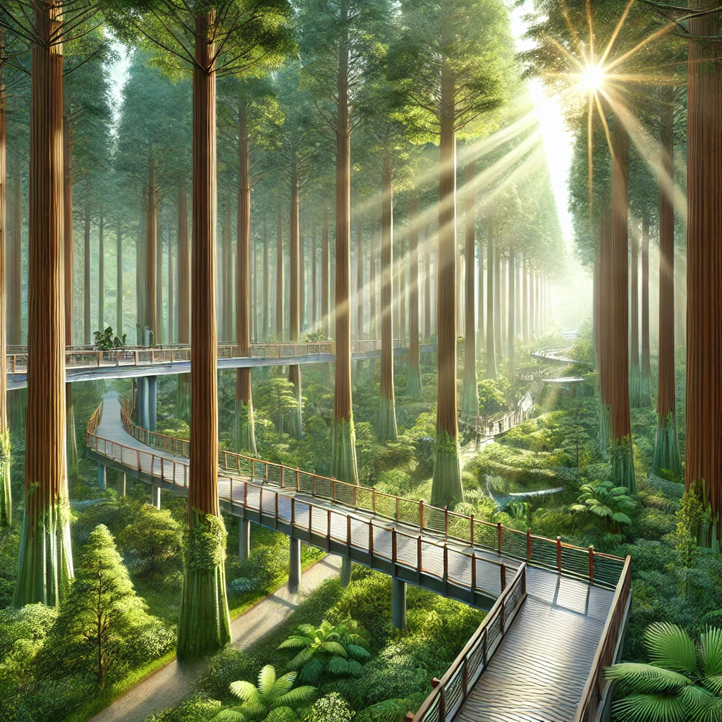 스카이웨이를 따라 걷다 보면, 어느새 나무의 중간 높이에서 메타세쿼이아 나뭇잎이 얼굴 가까이에 닿는 듯한 특별한 경험을 할 수 있습니다. 끝 지점에는 나선형으로 올라가는 스카이타워가 자리해 있어, 정상에 도달하면 메타세쿼이아 숲의 우듬지와 눈을 맞추며 주변 풍경을 감상할 수 있습니다.