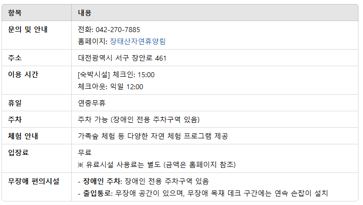 장태산자연휴양림은 자연의 아름다움과 힐링을 동시에 즐길 수 있는 대전의 대표적인 자연 휴양지입니다. 지친 일상에서 벗어나 가족, 친구, 연인과 함께 푸른 숲 속에서 여유와 힐링을 만끽해보세요.